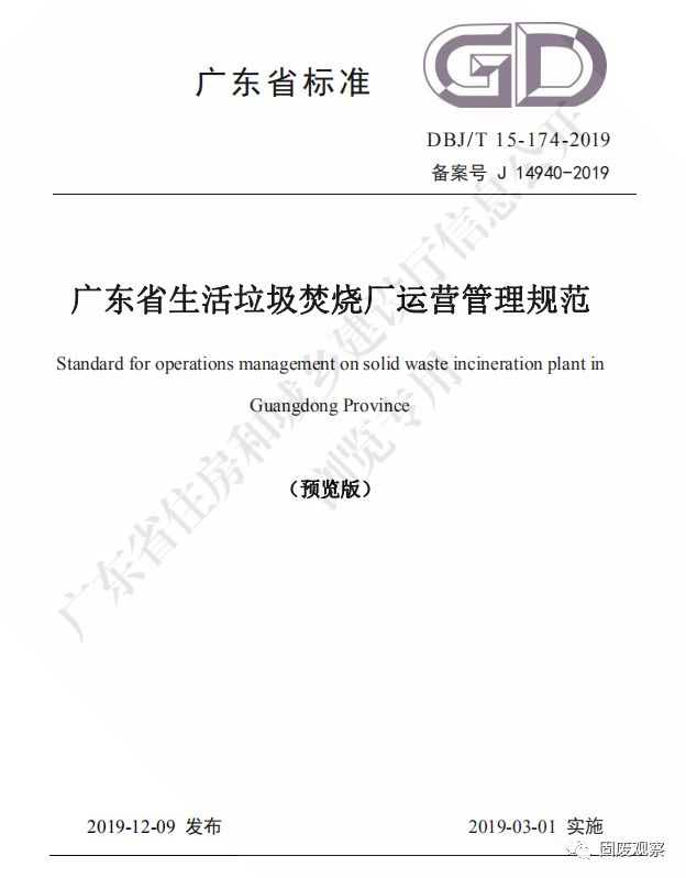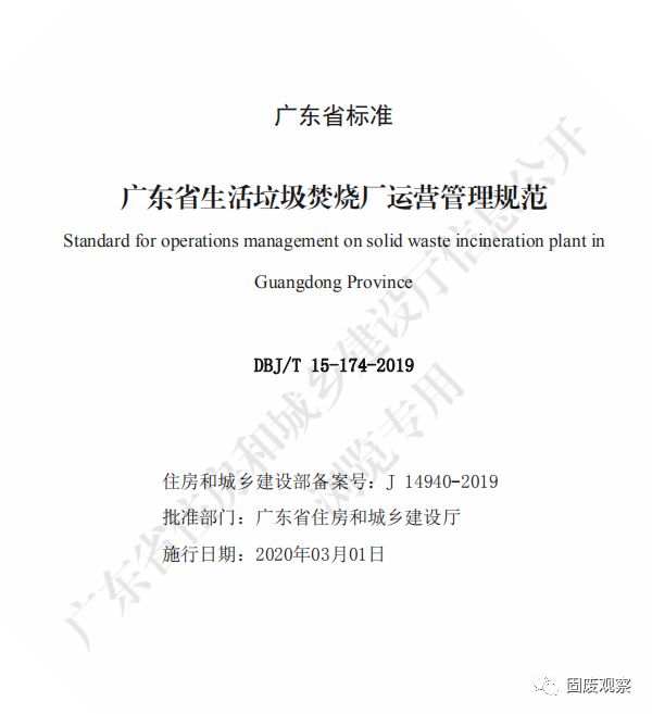 廣東省住房和城鄉(xiāng)建設(shè)廳關(guān)于發(fā)布廣東省標(biāo)準(zhǔn)《廣東 省生活垃圾焚燒廠運(yùn)營管理規(guī)范》的公告 粵建公告〔2019〕82 號 經(jīng)組織專家委員會(huì)審查,現(xiàn)批準(zhǔn)《廣東省生活垃圾焚燒廠運(yùn)營管理 規(guī)范》為廣東省地方標(biāo)準(zhǔn),編號為 DBJ/T 15-174-2019。