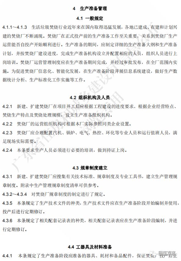 4.1.2 焚燒廠生產(chǎn)準(zhǔn)備的內(nèi)容應(yīng)包括但不限于:生產(chǎn)準(zhǔn)備組織機(jī)構(gòu)設(shè)立、生產(chǎn)準(zhǔn)備人員 配置、生產(chǎn)準(zhǔn)備人員培訓(xùn)、規(guī)章制度的建立、工器具及材料準(zhǔn)備、生產(chǎn)運(yùn)營準(zhǔn)備及信息系 統(tǒng)建設(shè)等。
