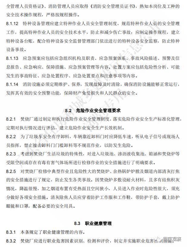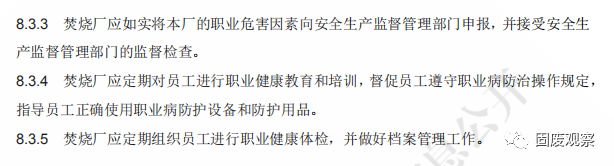 8.3.1 焚燒廠職業(yè)健康管理應(yīng)包括:職業(yè)病危害因素檢測、職業(yè)病危害申報(bào)、職業(yè)衛(wèi)生 培訓(xùn)、職業(yè)健康檢查等。