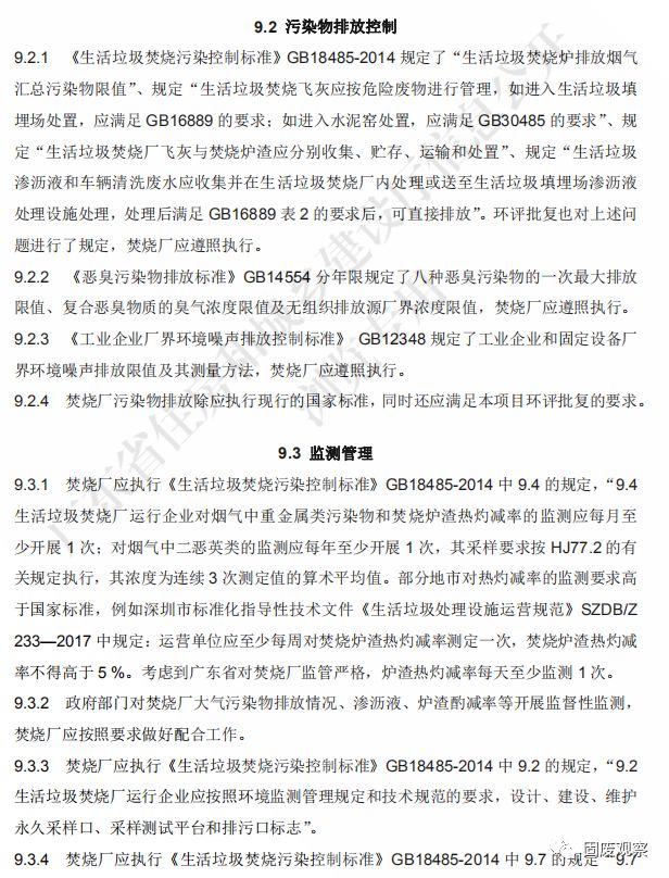 9.2.1 煙氣污染物的排放、飛灰與爐渣的處理、生活垃圾滲瀝液和車輛清洗廢水的處理 應(yīng)執(zhí)行環(huán)評批復(fù)及《生活垃圾焚燒污染控制標(biāo)準(zhǔn)》GB18485 的要求。