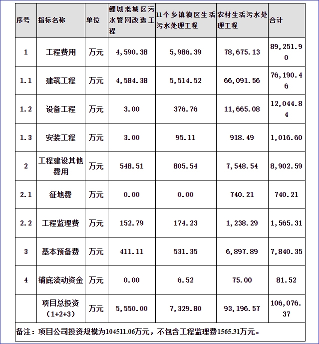 總投資(新建部分)為106076.37萬元(不含建設期利息,含征地費),其中直接工程費用為89251.90萬元,工程建設其它費用為8902.59萬元,基本預備費為7840.35萬元,鋪底流動資金81.52萬元。但值得關注的是,工程監(jiān)理工作由政府方委托或公開招標,工程監(jiān)理費用1565.31萬元由政府方支付,故項目公司投資總額為104511.06萬元。