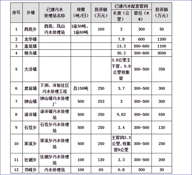 存量部分即已建好的污水處理廠及管網分別位于西苑鄉(xiāng)、龍華鎮(zhèn)、蓋尾鎮(zhèn)、榜頭鎮(zhèn)、大濟鎮(zhèn)、度尾鎮(zhèn)、鐘山鎮(zhèn)、游洋鎮(zhèn)、石蒼鄉(xiāng)、菜溪鄉(xiāng)、社硎鄉(xiāng)、書峰鄉(xiāng)等鄉(xiāng)鎮(zhèn)。具體內容和規(guī)模如下表。項目建設完成后,污水處理后出水排入GB3838 地表水Ⅲ類功能水域(劃定的飲用水水源保護區(qū)和游泳區(qū)除外)、GB3097 海水二類功能水域和湖、庫等封閉或半封閉水域時,執(zhí)行一級標準的B標準。