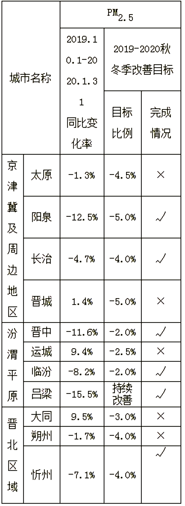 2019年10月-2020年1月各市秋冬季大氣污染綜合治理攻堅行動空氣質(zhì)量改善目標完成情況
