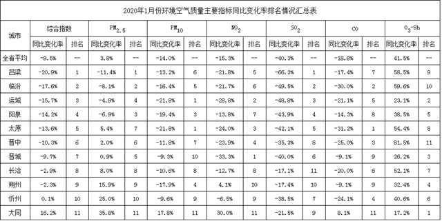 2、2020年1月份環(huán)境空氣質(zhì)量主要指標同比變化率排名情況匯總表