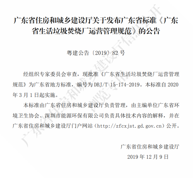 廣東省住房和城鄉(xiāng)建設(shè)廳關(guān)于發(fā)布廣東省標(biāo)準(zhǔn)《廣東省生活垃圾焚燒廠運(yùn)營(yíng)管理規(guī)范》的公告