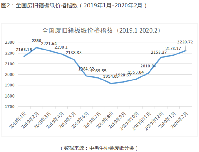圖1:全國瓦楞紙平均價(jià)格走勢(2019年1月-2020年2月)