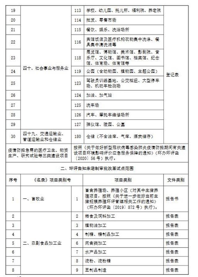 豁免部分項目環(huán)評手續(xù)辦理。繼續(xù)落實好已出臺的新冠肺炎疫情防控期間急需的醫(yī)療衛(wèi)生、物資生產(chǎn)、研究試驗等三類建設(shè)項目環(huán)評應(yīng)急服務(wù)保障政策。加強與排污許可制銜接,對照《建設(shè)項目環(huán)境影響評價分類管理名錄》(以下簡稱《名錄》),對關(guān)系民生且納入《固定污染源排污許可分類管理名錄(2019年版)》實施排污許可登記管理的相關(guān)行業(yè),以及社會事業(yè)與服務(wù)業(yè),不涉及有毒、有害及危險品的倉儲、物流配送業(yè)等10大類30小類行業(yè)的項目,不再填報環(huán)境影響登記表。