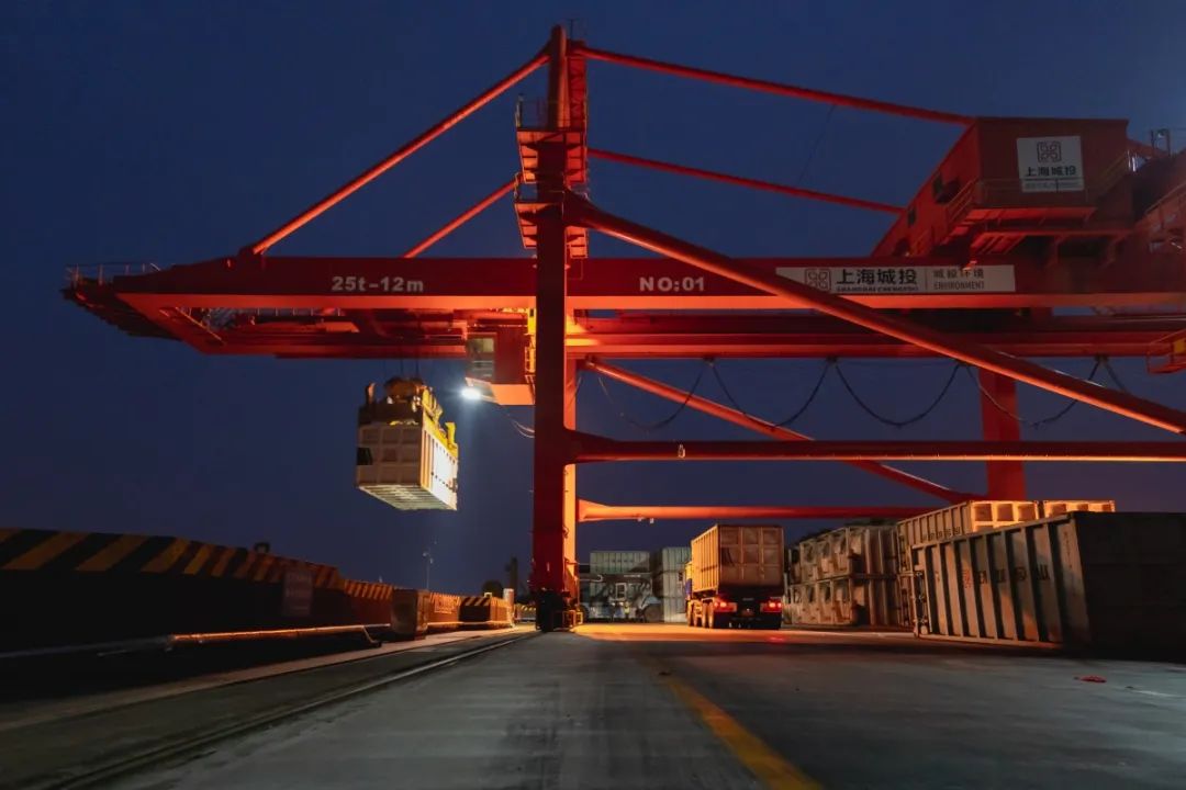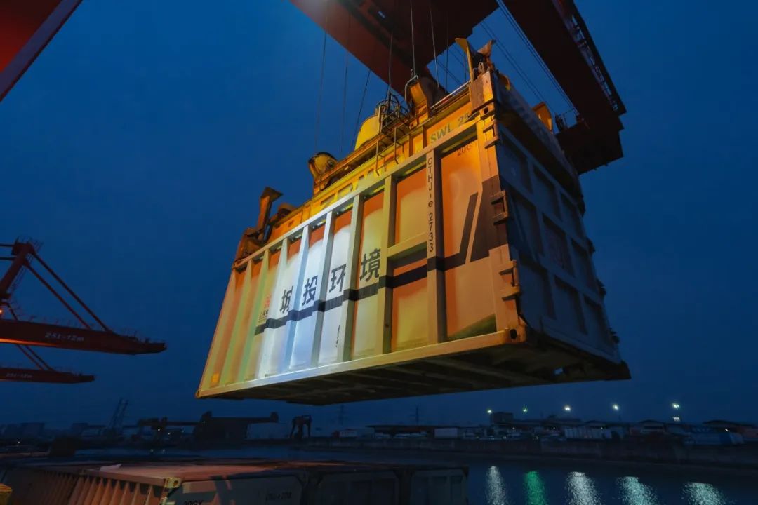 ▲生活垃圾在卸料大廳經(jīng)過壓縮后,被裝進集裝箱,然后由短駁車輛運到碼頭,再由裝載設備起吊到水運船上,最后由船運到位于浦東的老港生活垃圾處置基地進行末端處置。運輸船單程航距為111公里,時長11到12個小時。這樣一個集裝箱可裝入約16噸垃圾,1艘船可裝30個集裝箱。