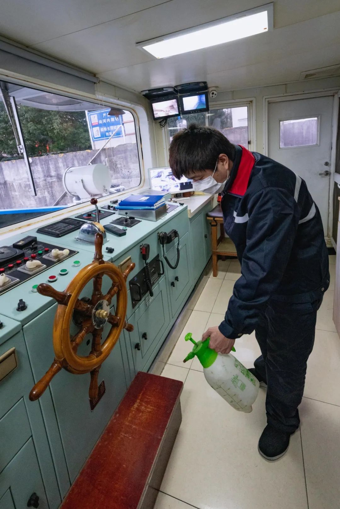 ▲筆者來到船上,遇見船上工作人員在做消毒工作。