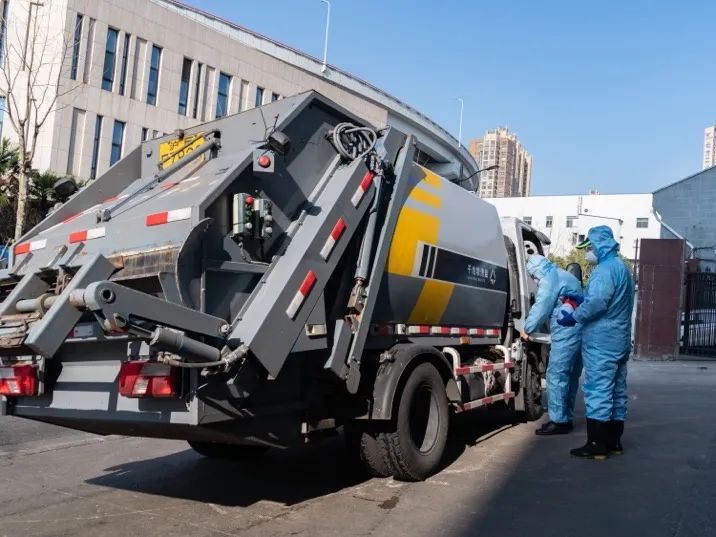 ▲環(huán)衛(wèi)工人出發(fā)前認真檢查運輸車輛,準備將特殊垃圾運往江橋生活垃圾焚燒廠進行無害化焚燒處理。