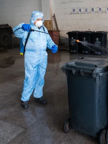 ▲兩個環(huán)衛(wèi)工人穿著嚴嚴實實的防護服上門收集特殊垃圾,按規(guī)定進行消毒和包扎。