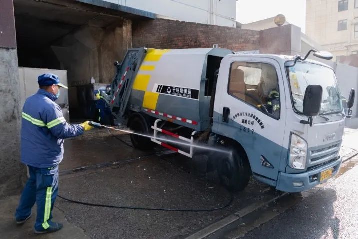 ▲環(huán)衛(wèi)工人在清洗環(huán)衛(wèi)運輸車輛。