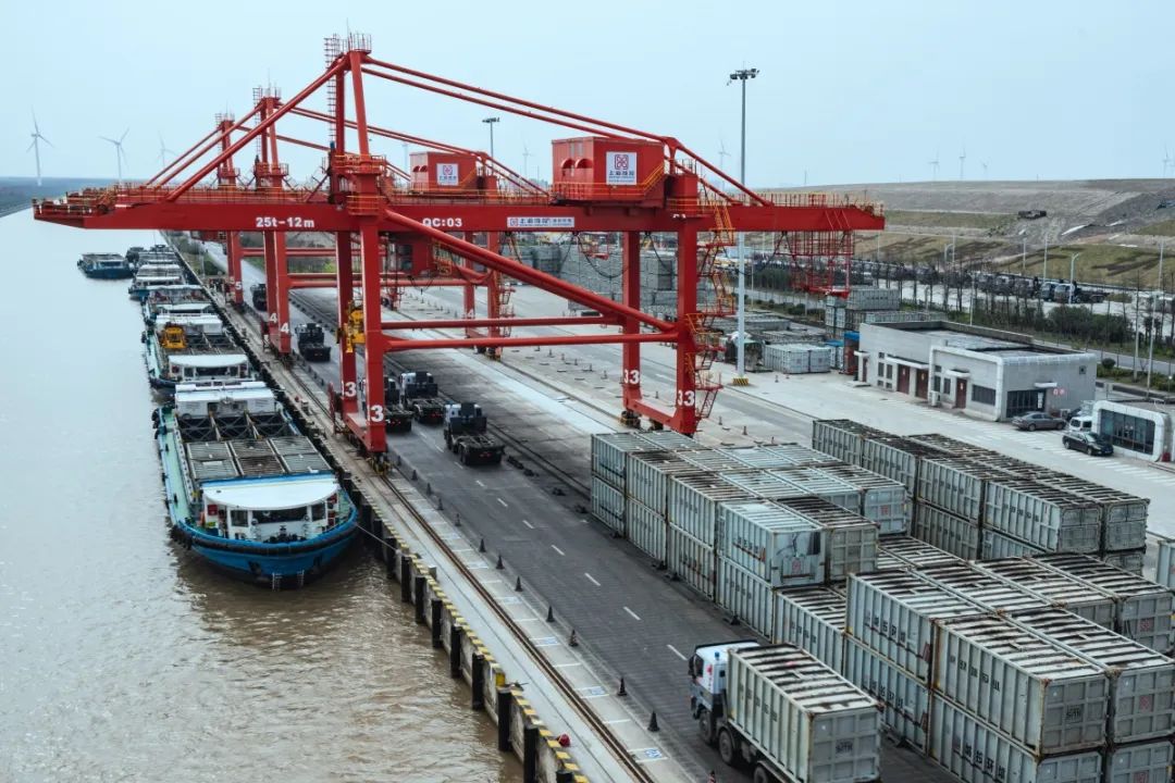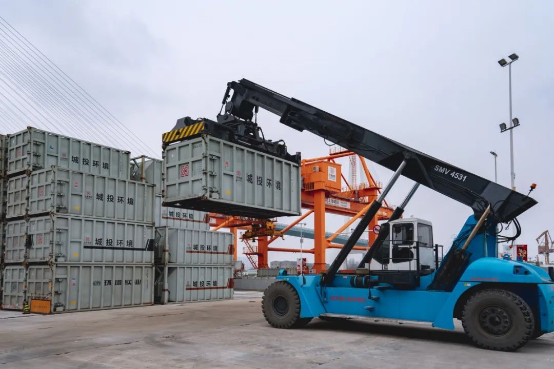 ▲碼頭裝載設備在對空置集裝箱進行整理碼放。