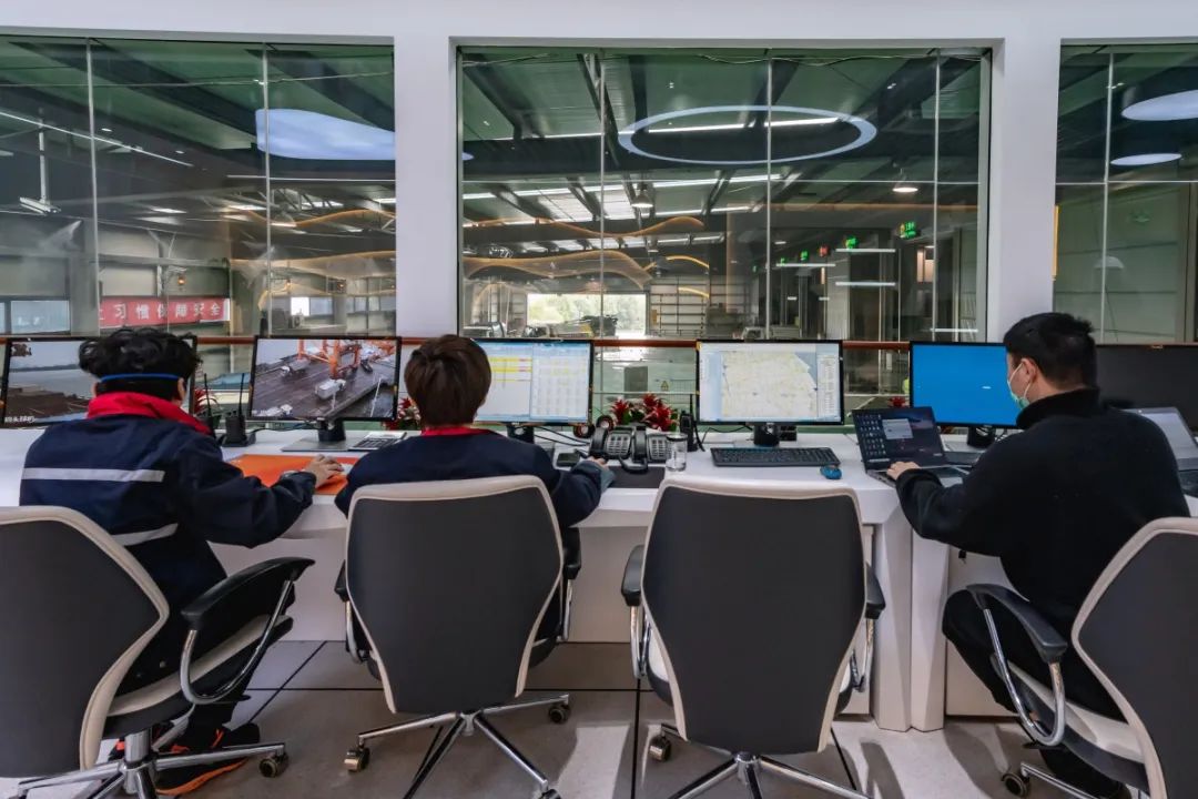 ▲3個碼頭的裝卸作業(yè)都有智能化監(jiān)控系統(tǒng),裝卸工作緊張有序地進行。這里是老港碼頭的智能監(jiān)控室。