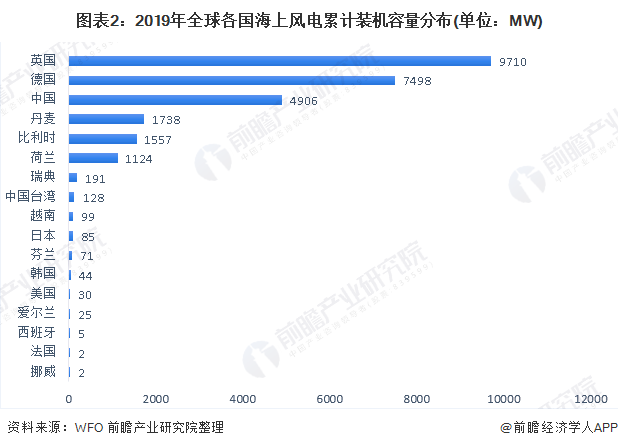 從全球各國已投運(yùn)海上風(fēng)電場(chǎng)的裝機(jī)容量對(duì)比來看,英國仍然占據(jù)領(lǐng)先地位。2019年,英國海上風(fēng)電累計(jì)裝機(jī)容量達(dá)到9.7MW;其次是德國,海上風(fēng)電累計(jì)裝機(jī)量7.5GW;中國是全球海上風(fēng)電第三大市場(chǎng),累計(jì)裝機(jī)容量4.9GW。