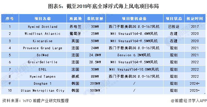目前,浮式海上風(fēng)電項(xiàng)目開始受到各國的關(guān)注。截至2019年底,全球共有10個(gè)浮式海上風(fēng)電項(xiàng)目(不包括示范項(xiàng)目),其裝機(jī)容量達(dá)到1000.3MW。從項(xiàng)目狀態(tài)來看,已投運(yùn)的浮式海上風(fēng)電項(xiàng)目有1個(gè),在建的有2個(gè),規(guī)劃期內(nèi)的有7個(gè);從國別布局來看,法國布局項(xiàng)目最多,達(dá)到4個(gè);其次是韓國和英國分別有2個(gè);葡萄牙和挪威分別有1個(gè)。