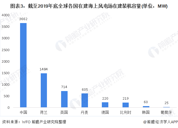 截至2019年底,全球共有23個(gè)在建海上風(fēng)電項(xiàng)目,共7GW;其中中國在建海上風(fēng)電項(xiàng)目達(dá)到13個(gè),占全球56.5%。同時(shí),從裝機(jī)容量分布來看,中國在建海上風(fēng)電項(xiàng)目的裝機(jī)容量高達(dá)3.7GW,占全球在建海上風(fēng)電項(xiàng)目容量的52.9%。可以看出,中國在海上風(fēng)電市場(chǎng)的布局快速擴(kuò)張。同時(shí),前瞻結(jié)合目前全球已投運(yùn)的裝機(jī)容量以及在建裝機(jī)容量來看,中國在2020年后將有可能成為全球最大的海上風(fēng)電市場(chǎng)。