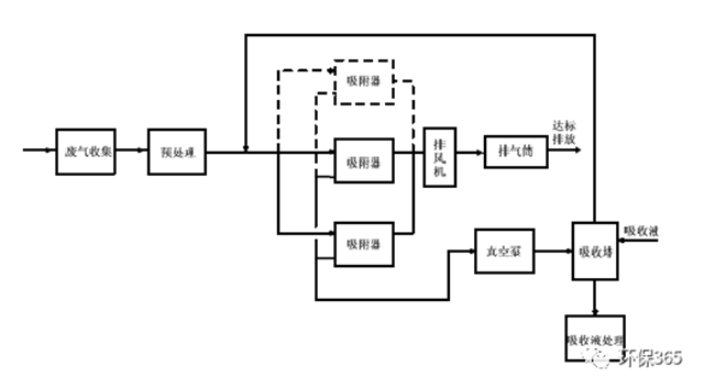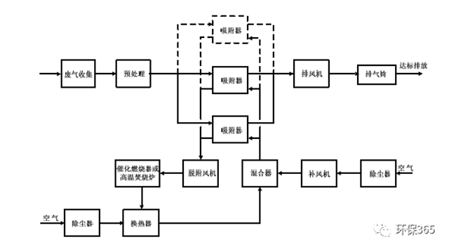 應(yīng)根據(jù)廢氣的來源、性質(zhì)(溫度、壓力、組分)及流量等因素進(jìn)行綜合分析后選擇工藝路線。根據(jù)吸附劑再生方式和解吸氣體后處理方式的不同,可選用的典型治理工藝有: