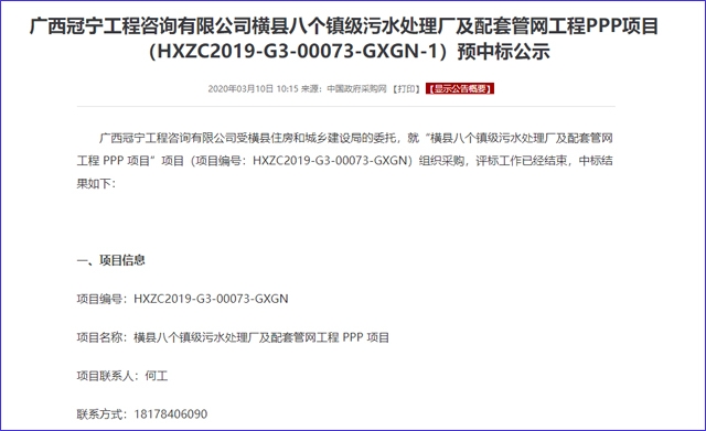 基于1.44元/噸運(yùn)營(yíng)水價(jià)、7.52%年投資收益率、0.50%建筑安裝工程下浮率,源自中國(guó)政府采購(gòu)網(wǎng)日前報(bào)道稱,橫縣八個(gè)鎮(zhèn)級(jí)污水處理廠及配套管網(wǎng)工程 PPP 項(xiàng)目(編號(hào):HXZC2019-G3-00073-GXGN)將由廣西環(huán)保產(chǎn)業(yè)投資集團(tuán)有限公司和航天凱天環(huán)??萍脊煞萦邢薰镜穆?lián)合體斬獲。