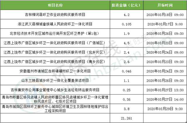 環(huán)保在線關注環(huán)衛(wèi)市場動態(tài)時發(fā)現,短短幾天時間,招標市場就聚集了多個環(huán)衛(wèi)相關標的,項目總投資額高達21億元。