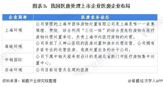 目前我國醫(yī)廢領(lǐng)域布局的企業(yè)較少,暫未形成激烈競爭的局面,相關(guān)的上市公司有上海環(huán)境、高能環(huán)境、中鋼國際、啟迪環(huán)境等。以下是4家與疫情期間醫(yī)廢處理相關(guān)的上市公司的布局情況: