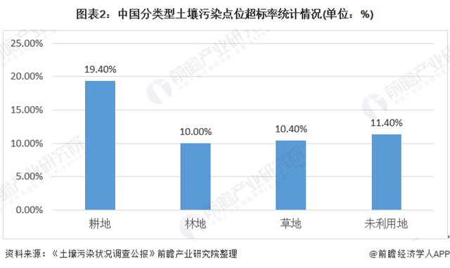 根據原國土部和環(huán)保部的聯(lián)合調查,2014年我國土壤環(huán)境狀況總體不容樂觀,部分地區(qū)土壤污染較重,耕地土壤環(huán)境質量堪憂,工礦業(yè)廢棄地土壤環(huán)境問題突出,全國土壤總的點位超標率為16.1%。其中耕地、林地、草地土壤點位超標率分別為19.4%、10.0%和10.4%。明顯我國耕地土壤污染問題比其他地塊更為嚴重。