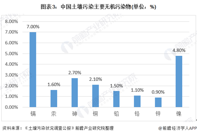 根據土壤調查公報顯示,全國土壤總的超標率為16.1%,污染類型以無機型為主,有機型次之,復合型污染比重較小,無機污染物超標點位數占全部超標點位的82.8%,主要無機污染物包括鎘、汞、砷、銅、鉛、鉻、鋅、鎳等重金屬,點位超標率分別為7.0%、1.6%、2.7%、2.1%、1.5%、1.1%、0.9%、4.8%。