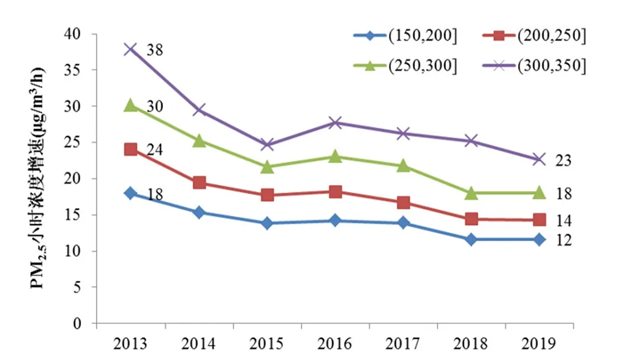 重污染過程期間,城市PM2.5 小時(shí)濃度增長速率能夠一定程度反映區(qū)域PM2.5累積增長的速度和所能達(dá)到的峰值濃度,反映出重污染過程期間的管控成效。2013年至2019年,從74城市小時(shí)重污染期間(PM2.5小時(shí)濃度超過150微克/立方米)的PM2.5增速來看,PM2.5小時(shí)濃度達(dá)到150—200微克/立方米區(qū)間時(shí)的平均增速由2013年的18微克/立方米/小時(shí)減緩為2019年的12微克/立方米/小時(shí);濃度進(jìn)入200—250微克/立方米區(qū)間時(shí)的增速由2013年的24微克/立方米/小時(shí)減緩為2019年的14微克/立方米/小時(shí);濃度進(jìn)入250—300微克/立方米區(qū)間時(shí)的增速由2013年的30微克/立方米/小時(shí)減緩為2019年的18微克/立方米/小時(shí)。即2013年至2019年間,城市PM2.5小時(shí)濃度達(dá)到重度及以上污染級別時(shí)的增速下降了40%左右,在相同時(shí)長的重污染過程中,PM2.5 所能達(dá)到的峰值濃度會顯著下降,這與我國重污染過程預(yù)警期間所采取的“削峰”應(yīng)急減排措施有密切關(guān)系。