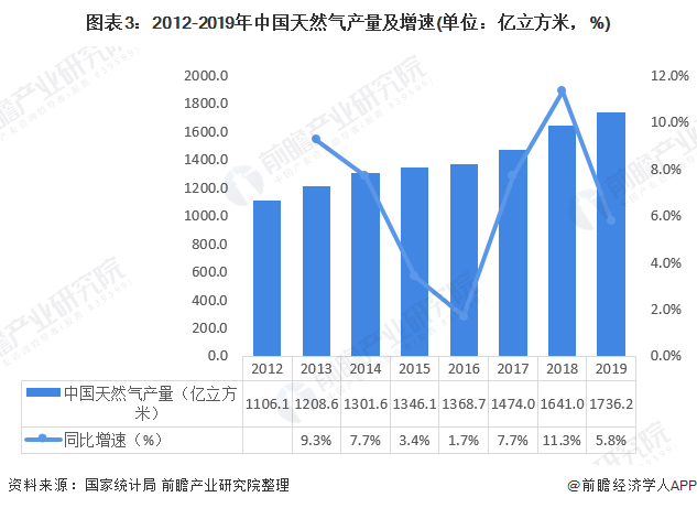 在天然氣開發(fā)方面,2012-2019年,中國天然氣產量逐年遞增,增速波動變化。根據國家統計局數據,2019年,中國天然氣產量為1736.2億立方米,較上年同期增長了5.8%,增速在經過了三年上升后開始下降。