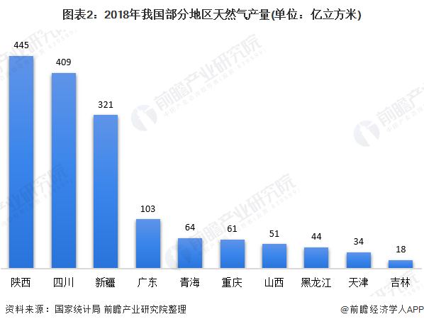 根據國家統計局的數據,2018年我國天然氣產量共實現1610億方,其中陜西省、四川省、新疆地區(qū)產量分別為445億方、409億方、321億方,分別占比27.6%、25.4%、20.0%。
