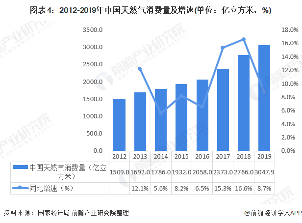 在天然氣需求方面,2012-2019年,中國天然氣消費量也逐年遞增,且近兩年增速快速提高。根據國家統計局數據,2019年,中國天然氣消費量為3047.9億立方米,較上年同期增長了8.7%,增速較上年同期回落7.9個百分點。