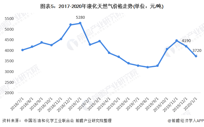 從我國液化天然氣價格走勢來看,近期價格波動劇烈。我國雖然天然氣缺口量大,但由于國家調控政策的影響,以及國際市場市場上天然氣需求不旺,整體價格偏低。在2018年8因中石油管道氣受限,以及逐漸進入冬季調峰供氣高峰期,液化氣價格持續(xù)升高。2018年1月因進口中亞國家天然氣管道發(fā)生故障,加之全國大范圍出現持續(xù)降溫,采暖用氣大幅度增加,天然氣供需矛盾非常突出,出現新一輪大幅度價格增長,到2018年12月底達到近兩年的最高值,即5280元/噸。2019年天然氣價格一路下滑,到年底出現小幅度波動,2019年12月底天然氣價格為4190元/噸,較上年年底下降21%左右。2020年1月底,天然氣價格已經跌破4000元/噸。