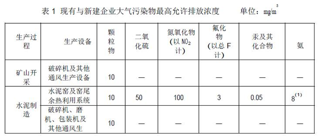 對于無組織排放的控制,《標(biāo)準(zhǔn)》要求在物料處理、輸送、裝卸等過程要實行封閉,尤其是在車船裝卸過程中還要采取有效的抑塵措施,生產(chǎn)車間內(nèi)不得有可見的顆粒物排放存在。在《標(biāo)準(zhǔn)》實施之日起,水泥工業(yè)企業(yè)大氣污染物無組織排放濃度限制要按照下表執(zhí)行: