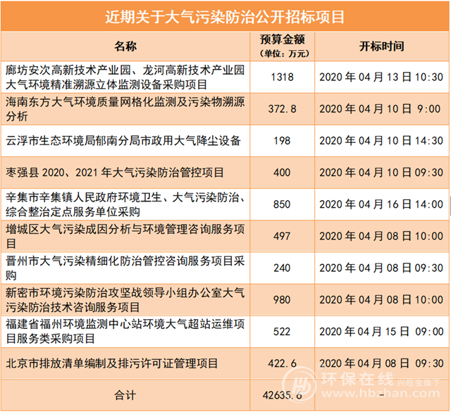 從中國政府采購網(wǎng)得知,近期關(guān)于大氣污染防治招標(biāo)的項(xiàng)目有10個(gè),均為2020年4月份開標(biāo),總金額達(dá)42635.6萬元,包括除塵設(shè)備、在線監(jiān)測(cè)系統(tǒng)、污染源探究等方面,具體如下: