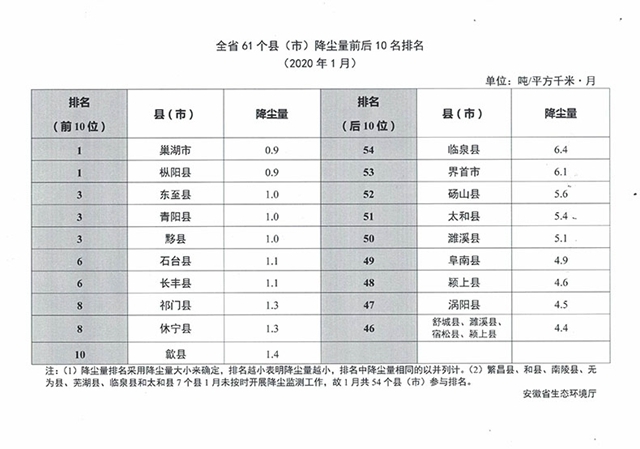 《全省61個縣(市)降塵量前后10名排名(2020年1月)》顯示:巢湖市、樅陽縣降塵量最小且相同,為0.9噸/平方千米·月。東至縣、青陽縣、黟縣降塵量相同(1.0噸/平方千米·月),并列第三位;臨泉縣降塵量最大(6.4噸/平方千米·月),其次是界首市和碭山縣。繁昌縣、和縣、南陵縣、無為縣、蕪湖縣、臨泉縣和太和縣7個縣1月未按時開展降塵監(jiān)測工作。