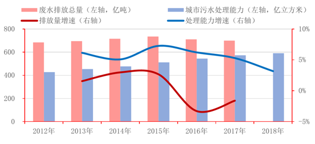 而從治理端來看,我國(guó)城市污水處理產(chǎn)能常年上漲,至2018年或已達(dá)到16200億立方米/日。將我國(guó)現(xiàn)有的污水處理產(chǎn)單日處理產(chǎn)能代入全年365天滿功率運(yùn)行計(jì)算,2017年僅城市污水處理能力就可以覆蓋同年全國(guó)廢水產(chǎn)生量的82%,這一數(shù)據(jù)較2012年大幅上漲了近20個(gè)百分點(diǎn),足以看出近年來我國(guó)污水處理行業(yè)的迅猛發(fā)展。