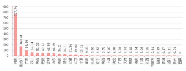 據(jù)各地方部門統(tǒng)計(jì)上報(bào),治理初期分布在我國(guó)220座城市的2100個(gè)黑臭水體中,廣東省所占數(shù)量最多,有243個(gè),其次為安徽、湖南、山東與江蘇;西藏地區(qū)沒有黑臭水體問題上報(bào)。但如果按水體面積衡量,河南省黑臭水體面積遠(yuǎn)超其他全部省份之和,高達(dá)769.74平方公里,為黑臭水體的“重災(zāi)區(qū)”;相比之下,第二名的黑龍江省僅為168.41平方公里。