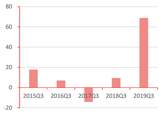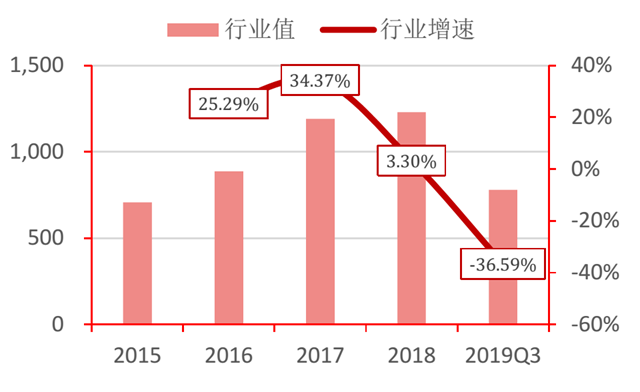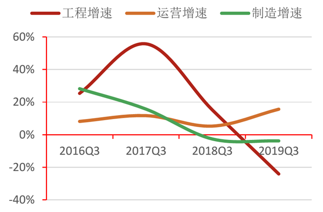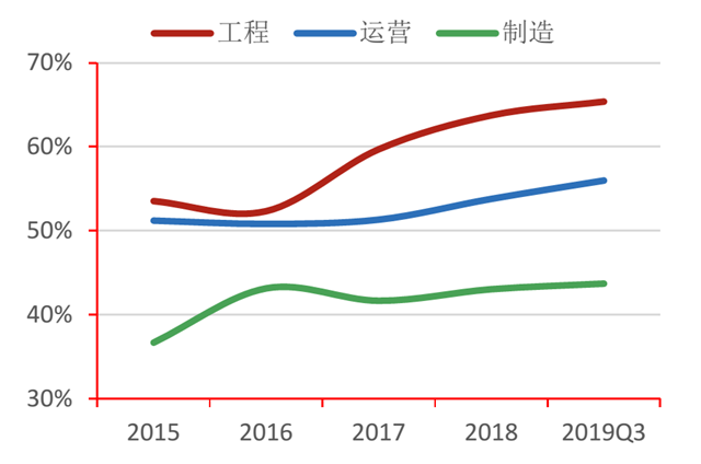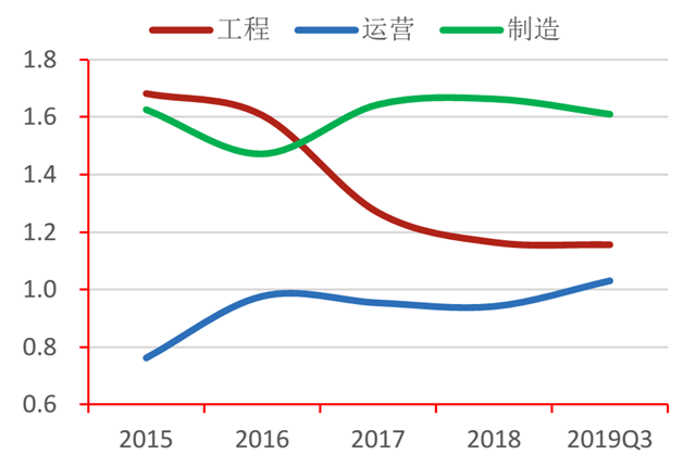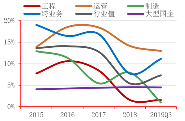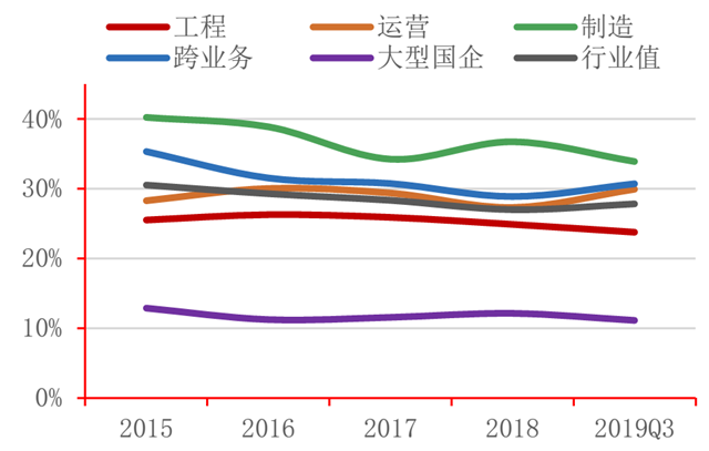 從盈利能力來看,行業(yè)營(yíng)業(yè)總收入、凈利潤(rùn)增速呈下降趨勢(shì)。其中,營(yíng)業(yè)收入自2015年以來增速最高達(dá)34.37%,2019年第三季度行業(yè)同比下降9.28%,工程、制造類企業(yè)同比下降24.03%、3.75%;凈利潤(rùn)絕對(duì)值在2017年達(dá)到152.17億后, 2018年縮減至66.64億。