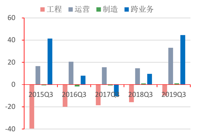 2)流動(dòng)性明顯回暖。其中,運(yùn)營(yíng)、制造與跨業(yè)務(wù)經(jīng)營(yíng)類企業(yè)經(jīng)營(yíng)性現(xiàn)金流凈額上升較快,工程類企業(yè)三季度凈額負(fù)值收窄。