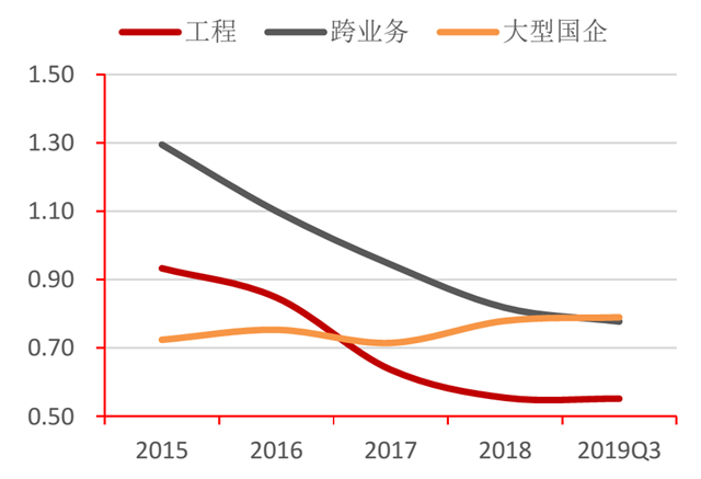 與同樣涉足工程項(xiàng)目的兩類企業(yè)相比,大型國(guó)企的流動(dòng)比率和速動(dòng)比率更穩(wěn)定,且呈小幅上升趨勢(shì)。2019年第三季度,大型國(guó)企的流動(dòng)比率為1.14,高于跨業(yè)務(wù)企業(yè);速動(dòng)比率為0.79,高于傳統(tǒng)工程類水企。