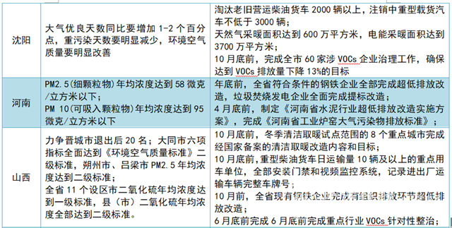 從上表可以看出,各地方在堅(jiān)持主要路線的情況下,結(jié)合實(shí)際情況,制定了攻堅(jiān)計(jì)劃,尤其是加快了對(duì)鋼鐵超低排放、推進(jìn)清潔能源和柴油車治理的進(jìn)程。