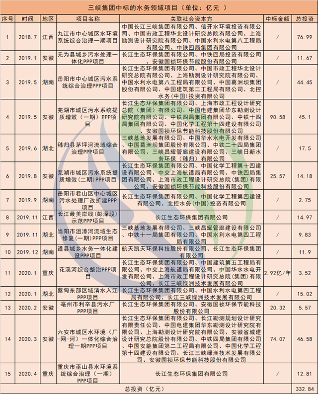 三峽集團(tuán)中標(biāo)的部分水務(wù)項目一覽77億!三峽集團(tuán)聯(lián)合中標(biāo)九江市中心城區(qū)水環(huán)境系統(tǒng)綜合治理一期項目90.58億!長江生態(tài)保護(hù)集團(tuán)聯(lián)合體斬獲蕪湖污水PPP項目
