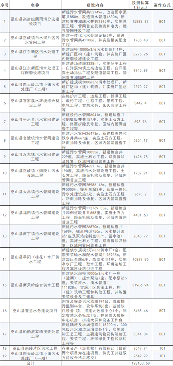 附:重慶市巫山縣水環(huán)境系統(tǒng)綜合治理(一期)PPP項目概況