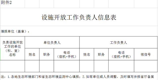 請(qǐng)各地生態(tài)環(huán)境部門和省生態(tài)環(huán)境監(jiān)測(cè)中心分別指定1名工作人員專門負(fù)責(zé)設(shè)施開(kāi)放工作,并認(rèn)真填寫《設(shè)施開(kāi)放工作負(fù)責(zé)人信息表》(附件2),于2020年4月8日前報(bào)送我廳。工作人員如有調(diào)整,應(yīng)及時(shí)組織工作交接并報(bào)省廳備案。