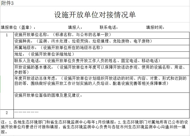 (一)加強(qiáng)工作指導(dǎo)。各地生態(tài)環(huán)境部門和省生態(tài)環(huán)境監(jiān)測(cè)中心每年年初要與設(shè)施開(kāi)放單位進(jìn)行一次工作對(duì)接,通過(guò)實(shí)地查看、座談、問(wèn)卷等形式核定開(kāi)放設(shè)施基本情況,梳理困難和需求,聽(tīng)取意見(jiàn)和建議,商定年度開(kāi)放活動(dòng)計(jì)劃和安排,并認(rèn)真填寫《設(shè)施開(kāi)放單位對(duì)接情況單》(附件3),于每年1月31日前報(bào)送省廳。同時(shí),定期與設(shè)施開(kāi)放單位進(jìn)行聯(lián)絡(luò),完善各項(xiàng)工作制度,及時(shí)提供指導(dǎo)幫助。2020年度《設(shè)施開(kāi)放單位對(duì)接情況單》報(bào)送時(shí)間為4月20日前。