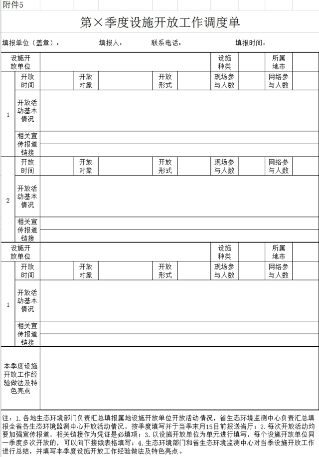 各地生態(tài)環(huán)境部門和省生態(tài)環(huán)境監(jiān)測(cè)中心每季度要集中總結(jié)設(shè)施開(kāi)放工作情況,填報(bào)《設(shè)施開(kāi)放工作調(diào)度單》(附件5),并于當(dāng)季末月15日前(如遇節(jié)假日順延)報(bào)送省廳。第一季度報(bào)送時(shí)間為4月20日前。省廳將評(píng)選優(yōu)質(zhì)內(nèi)容,向國(guó)家級(jí)媒體推薦。