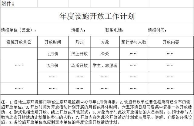 (二)制定工作計(jì)劃。每年1月份,各地生態(tài)環(huán)境部門和省生態(tài)環(huán)境監(jiān)測(cè)中心要按照各類《開(kāi)放工作指南》標(biāo)準(zhǔn),組織已公布的設(shè)施開(kāi)放單位制定本年度設(shè)施開(kāi)放工作計(jì)劃(詳見(jiàn)附件4),于每年1月31日前報(bào)送省廳。原則上,每個(gè)設(shè)施開(kāi)放單位在確保安全的前提下,每2個(gè)月至少組織1次開(kāi)放活動(dòng)(線上或線下等多種形式均可),全年至少6次(包括六五環(huán)境日集中組織的1次開(kāi)放)。2020年度工作計(jì)劃報(bào)送時(shí)間為4月20日前。