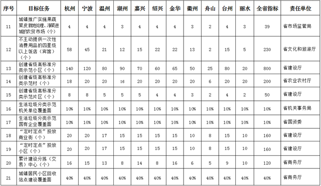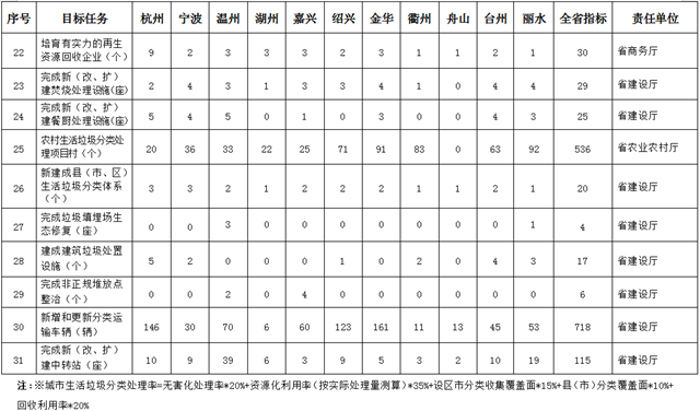到2020年底,通過強(qiáng)化源頭減量和垃圾處理設(shè)施建設(shè),全省城鄉(xiāng)生活垃圾總量基本實(shí)現(xiàn)“零增長(zhǎng)”和生活垃圾“零填埋”;全省城鎮(zhèn)、農(nóng)村生活垃圾分類覆蓋面分別達(dá)到90%、85%以上;全省城鄉(xiāng)生活垃圾回收利用率達(dá)到45%以上,資源化利用率達(dá)到90%以上,無害化處理率達(dá)到100%,力爭(zhēng)新增城鎮(zhèn)生活垃圾處理能力2萬噸/日以上,率先實(shí)現(xiàn)焚燒和餐廚垃圾處理設(shè)施縣縣全覆蓋;新增省級(jí)高標(biāo)準(zhǔn)生活垃圾分類示范小區(qū)500個(gè)以上;建立匹配完善的生活垃圾分類投放、分類收集、分類運(yùn)輸、分類處理體系,制度框架和政策體系基本形成,基層組織作用充分發(fā)揮,社會(huì)氛圍日益濃厚,共建共治共享治理體系初步形成。