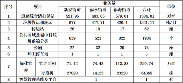 該項(xiàng)目的主要服務(wù)內(nèi)容以常規(guī)環(huán)衛(wèi)工作和服務(wù)業(yè)務(wù)為主,具體包括道路綜合清掃保潔、垃圾收運(yùn)和轉(zhuǎn)運(yùn)、公共區(qū)域及城中村垃圾分類(lèi)前端設(shè)施維護(hù)、公廁運(yùn)維管理、環(huán)衛(wèi)停車(chē)場(chǎng)建設(shè)運(yùn)維管理、智慧管理系統(tǒng)及平臺(tái)建設(shè)運(yùn)維、應(yīng)急保障等多個(gè)方面。具體如下: