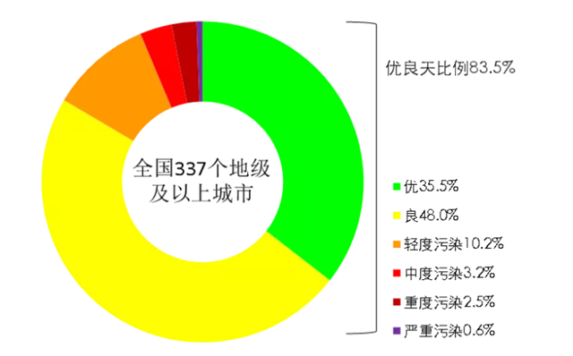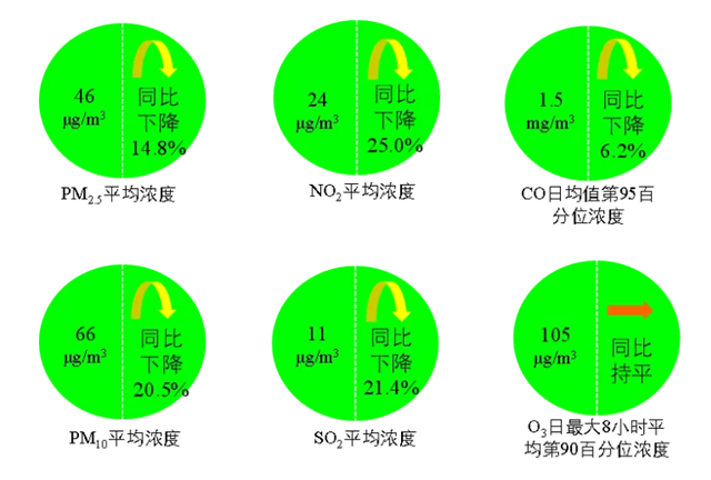 1-3月,全國(guó)337個(gè)地級(jí)及以上城市平均優(yōu)良天數(shù)比例為83.5%,同比上升6.6個(gè)百分點(diǎn);120個(gè)城市環(huán)境空氣質(zhì)量達(dá)標(biāo),同比增加24個(gè);PM2.5濃度為46微克/立方米,同比下降14.8%;PM10濃度為66微克/立方米,同比下降20.5%;O3濃度為105微克/立方米,同比持平;SO2濃度為11微克/立方米,同比下降21.4%;NO2濃度為24微克/立方米,同比下降25.0%;CO濃度為1.5毫克/立方米,同比下降6.2%。